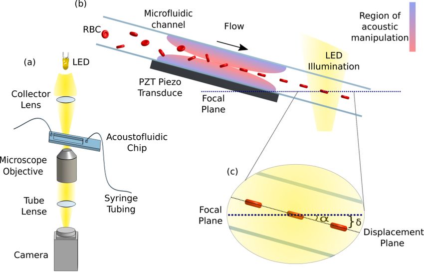 forms a controlled angle with the acoustic field’s focal plane located sive device usable for cytometry-based diagnosis, a highly desirable