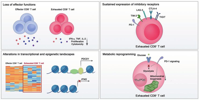 inhibitory receptors, altered transcriptional and epigenetic landscape, and metabolic reprogramming