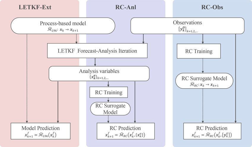 5634 F. Tomizawa and Y. Sawada: Combining ensemble Kalman filter and reservoir computing In NWP problems, it is often the case that homogenous Disclaimer. Publisher’s note: Copernicus Publications remains observation data of high resolution are not available over a neutral with regard to jurisdictional claims in published maps and wide range of time and space, which can be an obstacle to institutional affiliations. applying machine learning to NWP tasks (Dueben and Bauer, 2018). We revealed that RC is robust for the temporal sparsity of observations, and RC can be trained with relatively small Financial support. This research has been supported by the Japan training data sets. Society for the Promotion of Science (grant nos. JP17K18352 and JP18H03800), the JAXA (grant no. ER2GWF102), the JST AIP However, since the Lorenz 96 model (and other concep- (grant no. JPMJCR19U2), and the JST FOREST program (grant tual models such as the Kuramoto–Sivashinski equation) is no. JPMJFR205Q). ergodic, it is unclear whether our method can be applied to real NWP problems directly, which are possibly non-ergodic. Although our proposed method has the potential to extend Review statement. This paper was edited by Adrian Sandu and re- to larger and more complex problems, further studies are viewed by four anonymous referees. needed. 6 Conclusion References The prediction skills of the extended forecast with LETKF Asanjan, A., Yang, T., Hsu, K., Sorooshian, S., Lin, J., (LETKF-Ext), RC that learned the observation data (RC- and Peng, Q.: Short-Term Precipitation Forecast Based Obs), and RC that learned the LETKF analysis data (RC- on the PERSIANN System and LSTM Recurrent Neu- ral Networks, J. Geophys. Res.-Atmos., 123, 12543–12563, Anl) were evaluated under imperfect models and observa- https://doi.org/10.1029/2018JD028375, 2018. tions, using the Lorenz 96 model. We found that the pre- Bannister, R. N.: A review of operational methods of variational and diction by RC-Obs is substantially vulnerable to the sparsity ensemble-variational data assimilation, Q. J. Roy. Meteor. Soc., of the observation network. Our proposed method, RC-Anl, 143, 607–633, https://doi.org/10.1002/qj.2982, 2017. can overcome this vulnerability. In addition, RC-Anl could Bocquet, M. and Sakov, P.: Joint state and parameter estima- predict more accurately than LETKF-Ext when the process- tion with an iterative ensemble Kalman smoother, Nonlin. Pro- based model is biased. Our new method is robust to the im- cesses Geophys., 20, 803–818, https://doi.org/10.5194/npg-20- perfectness of both models and observations and we might 803-2013, 2013. obtain similar results in higher-dimensional and more com- Bocquet, M., Brajard, J., Carrassi, A., and Bertino, L.: Data assim- plex systems. Further studies on more complicated models or ilation as a learning tool to infer ordinary differential equation operational atmospheric models are expected. representations of dynamical models, Nonlin. Processes Geo- phys., 26, 143–162, https://doi.org/10.5194/npg-26-143-2019, 2019. Bocquet, M., Farchi, A., and Malartic, Q.: Online learning of both Code availability. The source code for RC and Lorenz96 model state and dynamics using ensemble Kalman filters, Found. Data is available at https://doi.org/10.5281/zenodo.3907291 and for Sci., https://doi.org/10.3934/fods.2020015, 2020. LETKF at https://github.com/takemasa-miyoshi/letkf (Miyoshi, Brajard, J., Carrassi, A., Bocquet, M., and Bertino, L.: Com- 2016). bining data assimilation and machine learning to emulate a dynamical model from sparse and noisy observations: a case study with the Lorenz 96 model, J. Comput. Sci., 44, 101171, Data availability. All the data used in this study can be calculated https://doi.org/10.1016/j.jocs.2020.101171, 2020. using the model source code. Chattopadhyay, A., Hassanzadeh, P., and Subramanian, D.: Data- driven predictions of a multiscale Lorenz 96 chaotic system using machine-learning methods: reservoir computing, artificial neu- Author contributions. The conception and design of this work and ral network, and long short-term memory network, Nonlin. Pro- the data interpretation were done by FT and YS. FT was responsi- cesses Geophys., 27, 373–389, https://doi.org/10.5194/npg-27- ble for the development of the model source codes, the execution 373-2020, 2020. of all model runs, and the paper preparation. YS provided critical Dueben, P. D. and Bauer, P.: Challenges and design choices comments on the paper. for global weather and climate models based on ma- chine learning, Geosci. Model Dev., 11, 3999–4009, https://doi.org/10.5194/gmd-11-3999-2018, 2018. Competing interests. The authors declare that they have no conflict Hochreiter, S. and Schmidhuber, J.: Long Short- of interest. Term Memory, Neural Comput., 9, 1735–1780, https://doi.org/10.1162/neco.1997.9.8.1735, 1997. Houtekamer, P. L. and Zhang, F.: Review of the ensemble Kalman filter for atmospheric data assimilation, Mon. Weather Rev., 144, 4489–4532, https://doi.org/10.1175/MWR-D-15-0440.1, 2016. Geosci. Model Dev., 14, 5623–5635, 2021 https://doi.org/10.5194/gmd-14-5623-2021