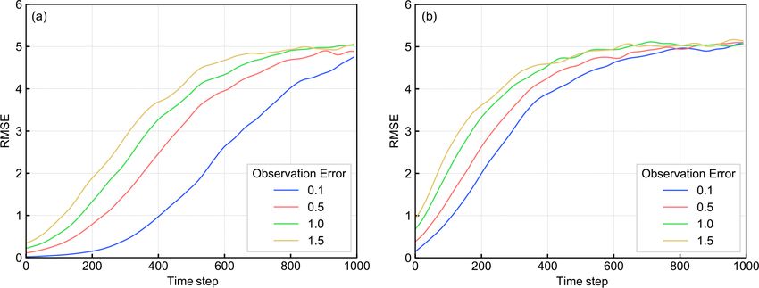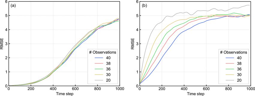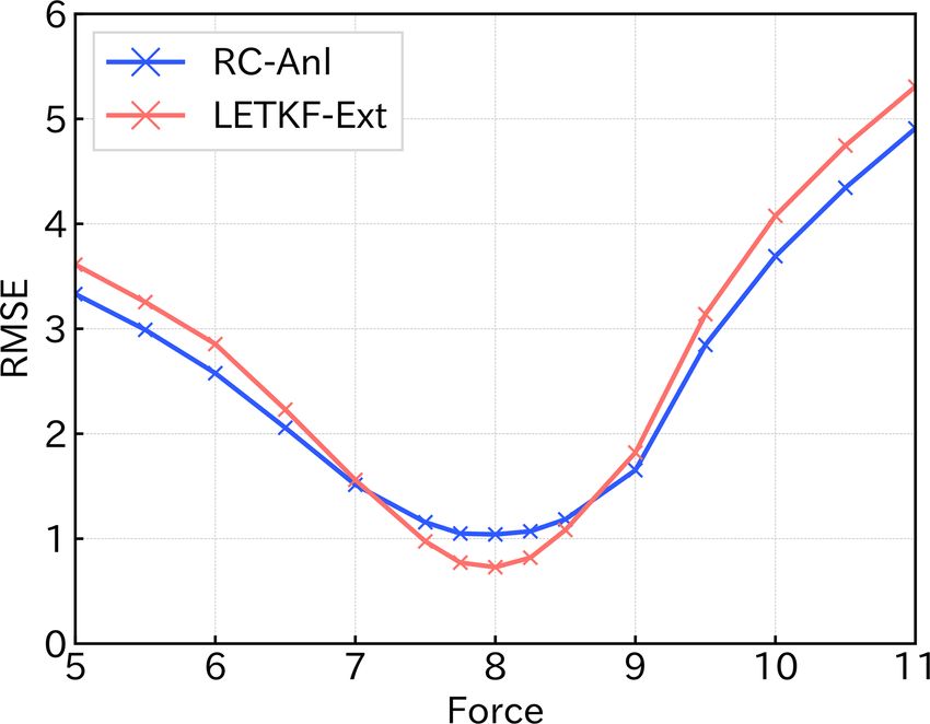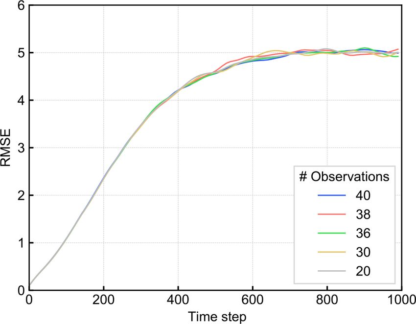 F. Tomizawa and Y. Sawada: Combining ensemble Kalman filter and reservoir computing 5631 Figure 6. The mRMSE time series of the predictions of (a) LETKF-Ext and (b) RC-Obs with noisy observation. Each color corresponds to the observation error indicated by the legend. Figure 7. The mRMSE time series of the predictions of (a) LETKF-Ext and (b) RC-Obs with spatially sparse observation. Each color corresponds to the number of the observation points. Table 2. Summary of three prediction frameworks. Name Initial value Model for prediction LETKF-Ext LETKF analysis the model used in LETKF RC-Obs observation RC trained with observation RC-Anl LETKF analysis RC trained with LETKF analysis Moreover, when the model used in LETKF is biased, RC- Anl outperforms LETKF-Ext. Figure 9a and b show the change of the mRMSE time series when changing the model biases. The number of the observed points was set to 20. The Figure 8. The same as Fig. 4, for the RC-Anl prediction. F term in Eq. (1) was changed from the true value 8 (the F value of the model for Nature Run) to values in [5.0, 11.0] as the model bias, and the accuracy of LETKF-Ext and RC-Anl Obs, no longer exists in RC-Anl. Although the prediction ac- is plotted. The accuracy of LETKF-Ext was slightly better curacy is lower than LETKF-Ext (Fig. 7a), our new method than that of RC-Anl when the model was not biased (F = 8; indicates a robustness to the observation sparsity and over- green line). However, when the bias is large (e.g., F = 10; comes the limitation of the standalone RC. gray line), RC-Anl showed the better prediction accuracy. https://doi.org/10.5194/gmd-14-5623-2021 Geosci. Model Dev., 14, 5623–5635, 2021
