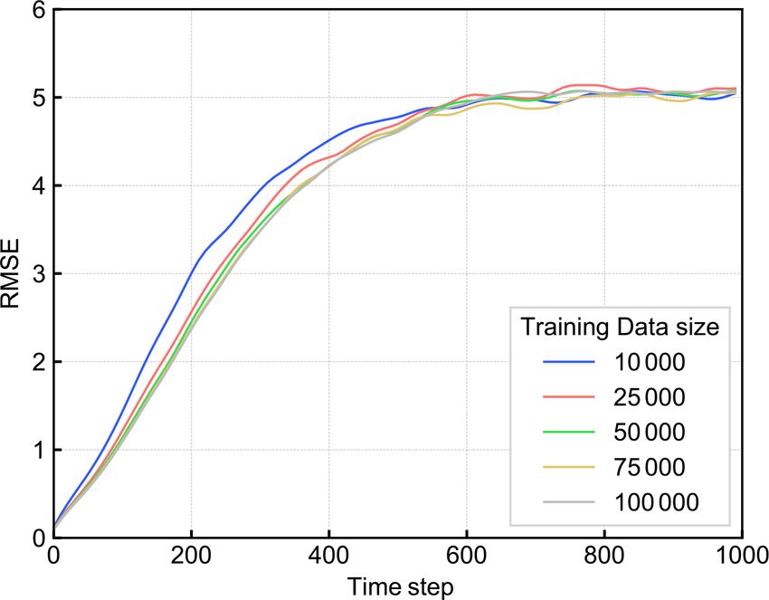 5632 F. Tomizawa and Y. Sawada: Combining ensemble Kalman filter and reservoir computing Figure 9. The mRMSE time series of the predictions of (a) LETKF-Ext and (b) RC-Anl with a biased model. Each color corresponds to each value of the F term. Figure 10. The mRMSE(80) of the predictions of LETKF-Ext(red) and RC-Anl(blue) for each model bias. Horizontal axis shows the value of the force parameter of Eq. (1) (8 is the true value) and vertical axis shows the value of mRMSE. Figure 11. The mRMSE time series of the predictions of RC-Anl with various lengths of training data, with perfect observations and a perfect model. Each color corresponds to the value of the size of We confirmed this result by comparing the mRMSE value training data. of RC-Anl and LETKF-Ext at the specific forecast lead time. Figure 10 shows the value of mRMSE(80) (see Eq. 26) as the function of the value of the F term. Both lines that show 5 Discussion the skill of RC-Anl (blue) and LETKF-Ext (red) are con- vex downward and have a minimum at F = 8, meaning that By comparing the prediction skill of RC-Obs and LETKF- the accuracy of both prediction methods is the best when the Ext, we confirmed that RC-Obs can predict with accuracy model is not biased. In addition, as long as the F value is in comparable to LETKF-Ext, if we have perfect observations. the interval [7.5, 8.5], LETKF-Ext has better accuracy than This result is consistent with Chattopadhyay et al. (2020), RC-Anl. However, if the model bias becomes larger than Pathak et al. (2017), and Vlachas et al. (2020), and we can that, RC-Anl becomes more accurate than LETKF-Ext. As expect that RC has the potential to predict various kinds of the bias increases, the difference between the mRMSE(80) of spatiotemporal chaotic systems. two methods becomes larger, and the superiority of RC-Anl However, Vlachas et al. (2020) revealed that the prediction becomes more obvious. We found that RC-Anl can predict accuracy of RC is substantially degraded when the observed more accurately than LETKF-Ext when the model is biased. grid points are reduced, compared to other machine learning We also checked the robustness for the training data size. techniques such as LSTM. Our result is consistent with their Figure 11 shows the change of the accuracy of RC-Anl by study. In contrast, Chattopadhyay et al. (2020) showed that changing the size of training data from 100 000 to 10 000 RC can predict the multi-scale chaotic system correctly even time steps. We confirmed that the prediction accuracy did not though only the largest-scale dynamics is observed. Compar- change until the size was reduced to 25 000 time steps. Al- ing these results, we can suggest that the states in the scale though we have used a large amount of training data (100 000 of dominant dynamics should be observed almost perfectly time steps; 68 model years) so far, the results are robust to the to accurately predict the future state by RC. reduction of the size of the training data. Geosci. Model Dev., 14, 5623–5635, 2021 https://doi.org/10.5194/gmd-14-5623-2021