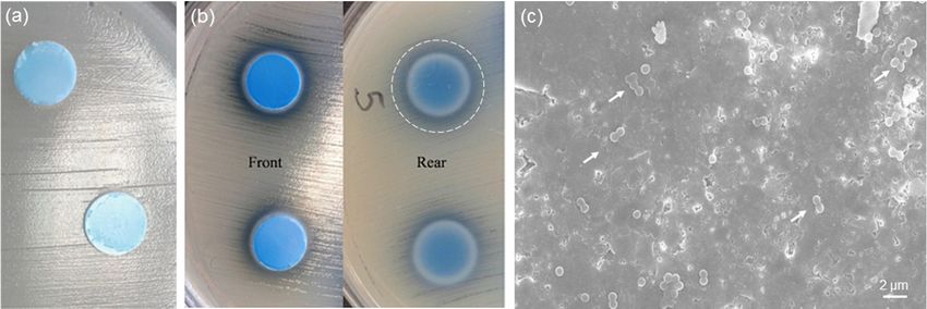 Bioengineering 2020, 7, 45 7 of 10 Bioengineering 2020, 7, x FOR PEER REVIEW 7 of 10 justify Atthe absence present, the of a clear antibacterial biomaterials community halo around assumes thethe that sample doped formation of awith the lower amount hydroxyapatite-like of layer copper. In summary, on the surface of a giventhese early soaked material results in demonstrate SBF is a proofthatofboth copper-doped its bioactivity and, toMBG somecompositions extent, of its exhibit an antimicrobial bone bonding effect ability in vivo against [26]. BeingStaphylococcus bioactive, the aureus Cu-doped andmesoporous motivate further investigation materials producedon in these highly this work canpromising be included bioactive and antibacterial in the versatile multifunctional class of mesoporous biomaterials. bioactive glasses (MBGs), which have attracted great interest over the last few years for potential use in tissue engineering applications [39]. Previous studies showed that MBGs with high silica content (>80 mol.%) are highly versatile carriers for antibiotics but exhibit negligible [19] or no antibacterial effect (equivalent effect to that of plastic control [40]) in the short term if used alone. Therefore, incorporation of copper was thought as a valuable strategy to impart inherent antimicrobial extra-functionalities to these silicate biomaterials. The results of the antibacterial tests performed on 1Cu-glass and 5Cu-glass discs are shown in Figure 7. As shown in Figure 7a, 1Cu-glass composition is apparently unable to create an inhibitory halo for bacteria around the sample. On the contrary, an inhibitory halo can be clearly observed around the 5Cu-glass sample (region of total inhibition around 2 mm around the outer surface) (Figure 7b). These results suggest that the initial concentration of copper in the MBG composition is key in dictating the antibacterial behavior, in agreement with previous observations reported by other authors. However, we should take into account that antibacterial materials can exert their antiseptic effect via (i) release-killing mode, which is due to the release of antibacterial ions, and/or (ii) contact-killing mode, if bacteria come in direct contact with the biomaterial. Hence, the visual inspection of the surface of 1Cu-glass sample is important to clarify whether a contact-killing antibacterial effect can still be elicited. In this regard, the lack of bacteria on the surface of the sample brought into contact with the bacteria-inoculated plate during the Kirby-Bauer test can provide an evidence of contact-mode antibacterial capacity. Figure 7c shows a SEM image of the 1Cu-glass surface after the Kirby-Bauer test: although this samples showed no inhibition halo, the image clearly shows that only few clusters of Staphylococcus aureus survived after 24 h of incubation on this material. Furthermore, it is worth underlining that the antibacterial effect of copper ions was reported to be more significant against Gram-negative bacteria, such as Escherichia Coli, compared to Gram-negative strains such as Staphylococcus Aureus [19], which could partially justify the absence of a clear Figure antibacterial halobioactivity 6. In vitro around the sample tests: doped with showing SEM micrographs the lower amount the of copper. “cauliflower” In summary, these calcium-phosphate earlyagglomerates results demonstrate formed onthat both copper-doped (a) 1Cu-glass MBG after and (b) 5Cu-glass compositions immersion exhibit an antimicrobial for 2 weeks in SBF; (c) XRDeffect against Staphylococcus analysis on 5Cu-glass aureus andin (2 weeks motivate further SBF), which investigation reveals the diffractiononpeaks theseofhighly promising hydroxyapatite bioactive formed and antibacterial multifunctional biomaterials. during the test. Figure Figure 7.7.In Invitro vitroantibacterial antibacterial experiments experiments (24inhibition (24 h): h): inhibition haloontests halo tests on (a) 1Cu-glass (a) 1Cu-glass and (b) and (b) 5Cu-glass; 5Cu-glass; (c) (c) SEM showing SEM micrograph micrograph showingofthe the surface surfaceafter 1Cu-glass of 1Cu-glass after the test (the whitethearrows test (the white the highlight arrows few highlight the few clusters of clusters of bacteria survived). bacteria survived). 4. Conclusions 4. Conclusions Copper-doped MBGs Copper-doped MBGs were wereobtained obtainedbybya wet (sol-gel) a wet route (sol-gel) in which route a non-ionic in which surfactant a non-ionic was surfactant incorporated as a mesopore template. After calcination, the glasses exhibited an ordered was incorporated as a mesopore template. After calcination, the glasses exhibited an ordered structure of mesopores structure arranged arranged of mesopores accordingaccording to hexagonal symmetry. to hexagonal The presence symmetry. of a mesoporous The presence texture of a mesoporous was thewas texture reason thebehind reason the apatite-forming behind propertyproperty the apatite-forming of these of glasses these despite glasses the highthe despite content high of silica content of silica (80 mol.%), as the large SSA (275–450 m2/g) was key to enhance the ion-exchange