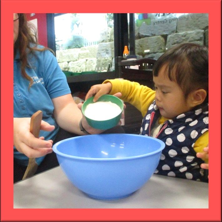 We began by asking Jade to pour in half of the flour followed by Dylan pouring the