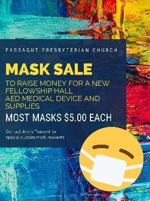 A big thank you to all who donated to the food drive for the Sunset Gap food pantry. Delivery was quite opportune as Second Harvest was unable to make their usual delivery due to in-house Covid cases. Your generosity is greatly appreciated. Eagle Scout Project: Jonathan Poston, one of the scouts from our church-sponsored Boy Scout Troop #444 is asking for donations for an Eagle Scout Project. He is working on a Fall Clothing Drive from Sept. 28- October 26 to benefit Holston Homes for Children. His goal is to collect 140 sets of new pajamas and 140 pairs of new socks for these children. They have urgent need for Medium thru Extra-Large children sizes. We have a big blue box in the narthex for drop off donations. Please contact Jonathan at 865/805-4898 with questions. Shepherd of Hope Food Pantry: Thank you for your monetary and item donations to the food pantry. During the month of September, the pantry served 128 needy guests! Special holiday food bags are planned for Thanksgiving and Christmas. As grocers are restricting special orders and limiting quantities, the pantry could use our help to secure special items. If you would like to donate items, please place them in the designated shopping cart located in our FPC Narthex. Storage space is limited at the pantry, so we will store items here until November but bring what you can, when you can! • Boxed Stuffing Mix • Cake Mix – any flavor • Cake Frosting in Can – any flavor • Regular Ground Coffee – any size – avoid flavored coffee • Tea – Regular bags for hot or cold – avoid flavored teas If you have other types of items to donate, you can leave them in the cart as well. Thanks for your generosity. Questions? Contact Betty Nicholls. Coalition for Appalachian Ministry (CAM) need: A CAM crafter is in great need of pint canning jars (16 oz.), rings and new lids. If you have any that you are no longer using contact Debbie Long. She will be making another fabric delivery in several weeks. FPC Merry Mask Makers have extra masks for sale at $5 each in the narthex. Please leave your check or cash in the designated box. All of the proceeds (100%) will go to purchase new medical equipment and supplies for Fellowship Hall. If you are interested in a custom-made mask, contact Jenny Trussell at cedarstudios4@gmail.com.