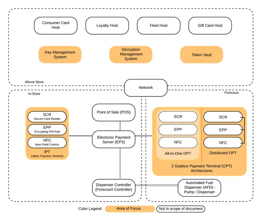 Interaction (POI), and a Network Communication Connection. Optionally, the site may include an Electronic Payment Server (EPS). The site may connect to one or more of the following: loyalty host, gift card host, fleet card issuer host, or consumer card host. This document will focus on the elements of this system which participate in the process of securing card or personally identifiable information (PII) data which include the POI, Key Management System/Strategy, Decryption Management System (DMS), and optionally a Token Vault System. 2.1.1 Point of Interaction (POI) A POI requires focus because it represents the part of the system where the payment data, and potentially PII, are entered by the customer. There are two categories of POI in the convenience and retail fueling industry: • Indoor Payment Terminal (IPT) - typically found in attended environments. In this case, the components that make up the POI are usually a single physical unit. • Outdoor Payment Terminal (OPT) - typically for unattended environments (e.g., pay at the pump, pay at the carwash). In an OPT, the components are more likely to be separate. A POI is typically made up of: • Secure Card Readers (SCR); • Encrypting PIN Pad (EPP); RFT_P2PE_InterimSecurityGuidance_WhitePaper Page 8 of 25 Copyright © CONEXXUS, INC., 2021, All Rights Reserved January 26, 2021