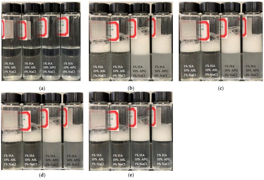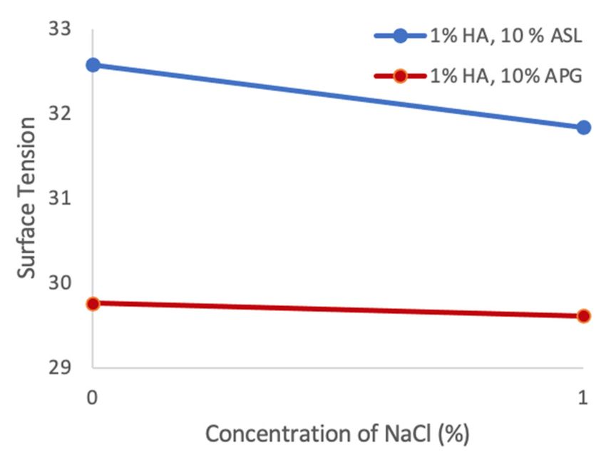 Cosmetics 2021, 8, 71 13 of 20 The figure above has kept on trend, increasing in surface tension as hyaluronic acid concentration is increased, but APG has decreased the overall surface tension measure- ments. The lowest surface tension value recorded was 29.189 at 0% HA. Surface tension then increased to 29.450 and 29.765 at 0.5 wt. % HA and 1 wt. % HA, respectively. 3.3.4. Effect of Salt Addition The effect of salt was observed for two systems, both containing 1 wt. % HA but one system with 10 wt. % ASL and the other with 10 wt. % APG. The concentration of NaCl varied between 0 and 1 wt. %. The surface tension values of both systems are shown in Figure 10. Figure 10. Effect of NaCl concentration on surface tension. Observing the system containing the acidic sophorolipid, salt addition had a greater effect on changing the surface tension. At 0% NaCl, the surface tension was 32.578, whereas, at 1% NaCl, the surface tension decreased to 31.837. The system containing APG did not change much; however, the surface tension did decrease slightly from 29.765 to 29.613 at 0% NaCl and 1% NaCl, respectively. The 1 wt. % dilutions were made of the formulations mentioned, in order to reduce viscosity, for the foaming study. The first five minutes of foam was recorded and is shown below in Figure 11. The best way to observe foamability is to analyze the total foam volume as well as how long bubbles last in the liquid phase. After analyzing the foaming for both systems, it can be seen that the salt concentration does not nearly impact the foaming abilities as much as the surfactant. The system containing APG has both a larger total foam volume, and has bubbles that last longer in the liquid phase. The 1% salt for the APG does have a slightly better total foam volume and more dense bubble presence in the liquid phase. The system containing ASL has a smaller total foam and has bubbles that escape to the air–water interface more rapidly. These results are further diminished with the removal of NaCl, showing that the 1% NaCl produces slightly better results. Overall, each system, regardless of the type of surfactant or whether NaCl is present, is homogeneous and quite stable.