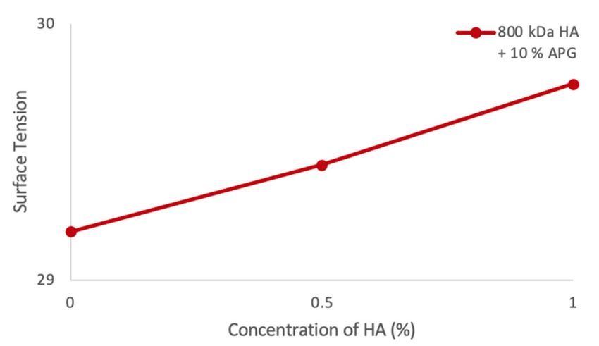 Cosmetics 2021, 8, 71 12 of 20 Analyzing the graph above, it can be shown that as the concentration of hyaluronic acid increases, the surface tension increases as well. The lowest surface tension recorded was 58.717 at 0.25 wt. % HA and jumps to 68.267 at 0.5 wt. % HA. From there, the increase in surface tension is more gradual, increasing to 70.932 and culminating at 72.353 for 0.75 wt. % HA and 1 wt. % HA, respectively. 3.3.2. Effect of Hyaluronic Acid with ASL The systems containing 10 wt. % ASL and a variety of hyaluronic acid concentrations were used for further characterization. The surface tension results are shown in Figure 8. Figure 8. Effect of HA concentration and ASL on surface tension. The addition of a surfactant drastically decreased the overall surface tension; how- ever, a similar trend is observed where surface tension increases as the concentration of HA increases. The surface tension of pure ASL is 31.875, which increases to 32.119 at a concentration of 0.5 wt. % HA. At 1 wt. % HA, the resulting surface tension is 32.578. 3.3.3. Effect of Hyaluronic Acid with APG Similarly, the effect of hyaluronic acid concentration on surface tension was measured for systems containing APG as its primary surfactant. The corresponding results are shown in Figure 9. Figure 9. Effect of HA concentration and APG on surface tension.