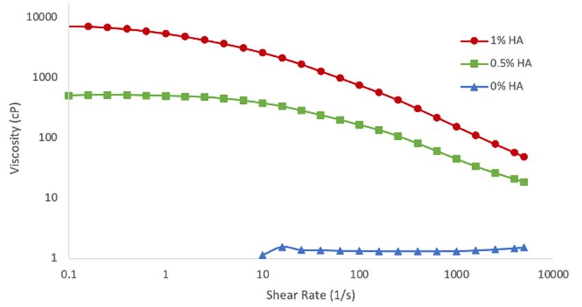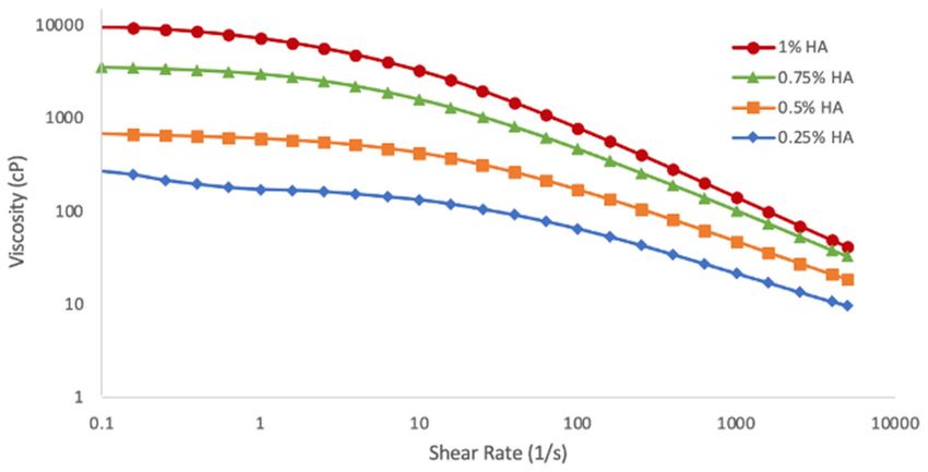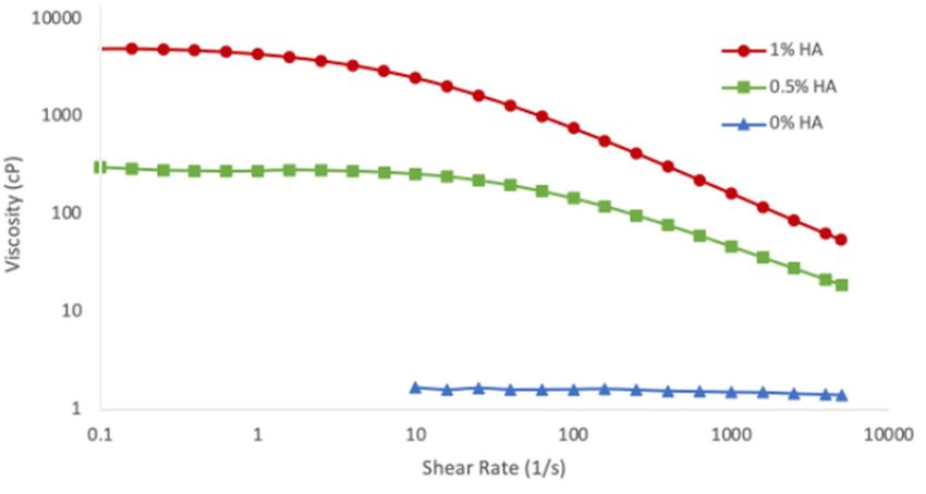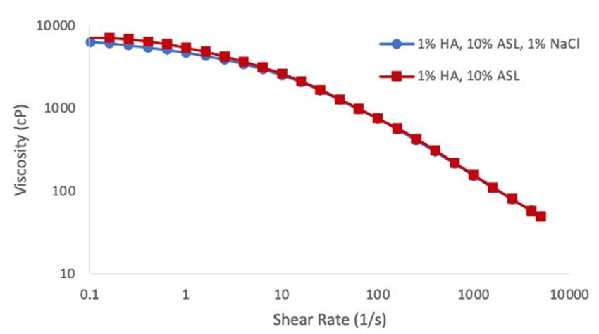 Cosmetics 2021, 8, 71 9 of 20 Figure 2. Effect of HA concentration on viscosity vs. shear rate. After analyzing the figure above, all concentrations of the 800 kDa hyaluronic acid are non-Newtonian, demonstrating shear-thinning properties. It can also be seen that 1 wt. % HA has the highest overall viscosity, and decreases as concentrations decreases, resulting in 0.25 wt. % HA to have the lowest overall viscosity. 3.2.3. Effect of Hyaluronic Acid with ASL The viscosity vs. shear rate was recorded of samples containing different concentra- tions of 800 kDa hyaluronic acid and 10 wt. % ASL. The results can be found in Figure 3. Figure 3. Effect of HA concentration with ASL on viscosity vs. shear rate. The samples containing 10 wt. % ASL and either 1 wt. % HA or 0.5 wt. % HA continue to be non-Newtonian with shear-thinning behavior as seen previously. It can also be observed the sample with 1 wt. % HA has the highest overall viscosity. The sample containing 10 wt. % ASL without hyaluronic acid is Newtonian and has the lowest overall viscosity. 3.2.4. Effect of Hyaluronic Acid with APG Similar formulations varying the hyaluronic acid concentration, replacing the 10 wt. % of ASL with 10 wt. % APG, were characterized. Figure 4 below gives an overview of the concentration of HA in each sample and the resulting flow curve.