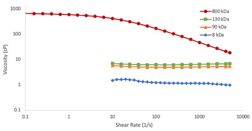 Cosmetics 2021, 8, 71 8 of 20 Table 6. Effect of HA Concentration with APG on Wet Combing Reduction Force. Wet Combing HA (wt. %) APG (wt. %) NaCl (wt. %) Reduction Force % 1.0 10 0 48.7 1.0 10 1.0 45.0 Observing the effect of salt addition on the system containing the acidic sophorolipid, at 0% NaCl, the reduction in wet combing force is at 71.9%; and at 1% NaCl, there is a significant increase to 78.1%, which is the largest reduction in wet combing force out of all the systems containing HA and a surfactant. Salt addition had a reverse effect on the system containing APG, where the reduction in the wet combing force decreased from 48.7% to 45% as salt increased from 0% to 1%. 3.2. Rheological Properties Rheology was used to analyze several parameters of the sample which can lead to predictions in the texture of a system, how a system will act under different shear conditions and can connect viscosity to tribological performance. The rheological profiles of different studies are depicted below. 3.2.1. Effect of Hyaluronic Acid Molecular Weight The formulations previously prepared, each consisting of 0.5 wt. % hyaluronic acid of a different molecular weight, with no sodium chloride or surfactant present, were used for further characterization. Figure 1 shows the corresponding flow curve for each molecular weight of hyaluronic acid. Figure 1. Effect of HA molecular weight on viscosity vs. shear rate. As seen in the graph above, the hyaluronic acid with the 800 kDa molecular weight can be classified as non-Newtonian with shear-thinning behavior, which are the desired rhe- ological effects. The other three lower-molecular-weight hyaluronic acids were Newtonian and decreased in viscosity as the molecular weight decreased. 3.2.2. Effect of Hyaluronic Acid Concentration The four samples prepared with the 800 kDa hyaluronic acid at different concentrations were used again to measure the viscosity as shear rate increases. Figure 2 outlines the resulting flow curves as the concentration of hyaluronic acid varies.