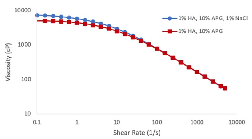 Cosmetics 2021, 8, 71 10 of 20 Figure 4. Effect of HA concentration with APG on viscosity vs. shear rate. The viscosity vs. shear rate effects of HA concentrations with APG are very similar to the trends shown with HA and ASL. 1 wt. % HA and 10 wt. % APG have the highest overall viscosity, and show shear-thinning, non-Newtonian characteristics along with 0.5 wt. % HA and 10 wt. % APG. The sample containing only 10 wt. % APG has the lowest overall viscosity and is Newtonian. 3.2.5. Effect of Salt Addition The four formulations that were utilized to study the effect of salt addition on sys- tems containing hyaluronic acid and a surfactant were used to test rheological properties. Figures 5 and 6 below show the flow curves for systems containing 1% HA, 10% surfactant and either 0% or 1% NaCl. Figure 5. Effect of NaCl concentration for HA + ASL on viscosity vs. shear rate.