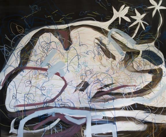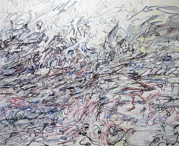 a tool of power, I want the dialogue between the different elements, the databank of images, emotions, colors and light traces in my head to speak for themselves. The scale and the long horizontal format presented a new challenge in terms of how to make the left and right sides of the canvas talk to each other and become one. Using the oil sticks, with their stronger and more fluid application, a forcefulness is required to translate a steady stroke onto the canvas. This task involves achieving the proper balance between what is happening internally and externally, balancing the depth of my mindscape with the media at my disposal. What are the psychological axes of the works on view in New York? “Balancing into the Deep” is very much inspired by the German movement Sturm und Drang, which is generally translated as “storm and stress.” The movement underscored the influence of nature, emotional distress and human individualism. Some of the pioneers of Sturm und Drang were Goethe and Schiller, whose writings of course I adore having grown up with and studied in Germany. My work has the obvious influence of nature, bits of memories and emotions metamorphosing and evolving through the spontaneity of my gestures. I always try to bring the natural world into the gallery through my art, emphasizing the overlap between human nature–emotional turbulence, expression and freedom–and that of the physical world. The polyptych on display at Sean Kelly is an exploration of the connectivity of images and compositions as abstractions of my memories and mindscape. I started doing polyptychs mostly at night and would start making small drawings on the living room table. I eventually wanted to start to connect each drawing with the previous, but rather than having the completed drawing next to it, I would try and hold the image of a composition in my head and continue as if they were side by side, though they physically were not. Sometimes I would draw one image, flip it around and play with the composition, then continue. I like the idea that I am creating differing relationships and possibilities that work aesthetically and still vary in how they fit together. Janaina Tschape, Schmetterlinge im Bauch, 2020, casein and color pencil on canvas, 76 cm x 91 cm. Photo Bailey Williams/Courtesy Den Frie Centre of Contemporary Art, Copenhagen