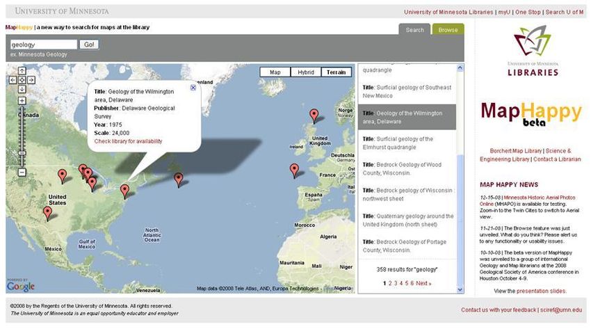 made available through library tools, including MapHappy. Also, we might easily bring in a large batch of records representing digital maps already cataloged by other institutions, for example the David Rumsey Historical Map Collection (http://www.davidrumsey.com/). There are many valuable pools of digitized and digital maps available on the web, such as those archived at ALA's MAGERT Map Scanning Registry (http://mapregistry.library.arizona.edu) and the Western Association of Map Libraries Scanning Projects Clearinghouse (http://www.waml.org/clearinghouse.html). A next necessary step is a large scale "clean up" of map MARC records that currently cannot be displayed geographically due to a lack of coordinates in the MARC records. Correcting this issue is possible, but labor intensive. A variety of approaches are being considered including programmatically geocoding records based on their Library of Congress subject headings, similar to the efforts carried out in the Biodiversity Heritage Library ( Freeland, Kalfatovic, Paige, and Crozier 2008). Otherwise re-cataloging the maps might involve manually locating and recording the information contained on the physical map or checking relevant databases, such as GeoBase or OCLC, to see if the data is available elsewhere for these items. Finally, there is the issue of implementation. How do we introduce MapHappy to our library users and streamline it into their information seeking behavior? Ideally, a link to MapHappy would be readily available to users while searching for maps or other cartographic materials in the public library catalog. Examples of this sort of mapping capability are beginning to appear in a variety of vendor databases and, with the proper programming support, could be inserted as a component of our OPAC. In addition, multiple promotion strategies will be geared toward our target audiences in the Map Library and the relevant university departments, like Geography and Geology. The Web 2.0 world and the map mashup options offer a world of possibilities and our "future plans" list could be never ending. MapHappy has been well received by our Minnesota Colleagues and thus far the initial user group feedback demonstrates that the representation of library records in a geospatial format provides a more intuitive and streamlined method of identifying maps. We look forward to the many future opportunities and challenges MapHappy affords our libraries with hopes of making accessible a wide range of collections previously meaningless or invisible to users. Acknowledgments: The authors would like to thank Gary Fouty, Jan Fransen, Blagovest Dachev and Heather Hessel for their invaluable assistance in the development, implementation, and support of this project. MapHappy is available for comment and review at http://www- dev.lib.umn.edu/scieng. Works Cited Freeland, C., Kalfatovic, M., Paige, J., & Crozier, M. (2008, March 24). Geocoding LCSH in the Biodiversity Heritage Library. Retrieved November 3, 2008, from The Code4Lib Journal: http://journal.code4lib.org/articles/52