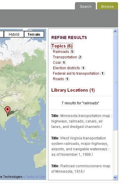 Figure #3: The Refine Results tools was integrated into the search results box allowing users to refine by Subject headings and by the library locations of MapHappy's search tab. Results and Discussion As expected, this project raised many questions and produced a new set of challenges and opportunities to be addressed when considering Web 2.0 applications as discovery tools for map libraries. Two problems we encountered, the issue of missing or faulty map coordinates and aligning the interface design with user-expectations, are discussed. Problem 1: Missing or Faulty Coordinates Two issues related to coordinates became apparent early in the pilot project phase as we examined the MARC records for Minnesota items extracted from our OPAC. First, not all records contained coordinates. Since not all records contained basic coordinate information which would allow us to represent the items on our geographic interface, mapped results only represent a limited subset of items available in our collections. However, all MARC records for cartographic items were extracted from the OPAC, even those that did not contain coordinate information, allowing users to produce search results in MapHappy that are similar to and as