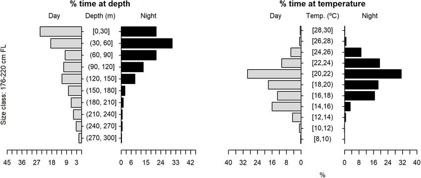 Marine Megafauna, from marked diel vertical movements, characterized by shallower mean depths during