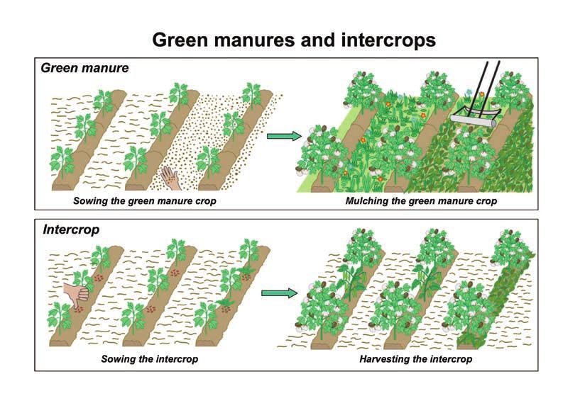 3.4 Green manures and intercrops Green manure crops for cotton (mainly pulses tive trap crop, see Chapter 5.3.2), with 10–15 m like sun hemp or cow pea, or mixtures contai- distance between the rows in order to reduce ning pulses and cereals) are usually sown bet- competition through shade. Smaller pulses like ween the cotton rows after the cotton seedlings moong bean, black gram and cow pea, or small have emerged. They are cut before or at the time millet varieties, can be grown in-between the of flowering, and are either used as mulch or cotton rows, or between the individual cotton incorporated into the soil. Intercrops like mai- plants. Intercrops are usually allowed to mature ze or pigeon pea can be grown in rows every and are cut and used as organic mulch after the few meters, replacing a row of cotton. Sunflo- seeds are harvested (Figure 10). wer can also be used as an intercrop (an effec- Figure 10: Green manures (cutting at the time of flowering) and intercrops (cutting after harvesting the seeds) for cotton Both green manures and intercrops have the On the other hand, green manure and inter- following benefits: crops do compete with the cotton crop for Distract pests from the cotton crop (especial- water, light and nutrients. Thus, appropriate ly sucking pests); timing of the sowing and cutting is very impor- Attract and host beneficial insects; tant in order to get maximum benefit with mi- Take up nutrients from the soil which would nimum competition. be lost to the crop; Farmers in Nagpur and Yavatmal, India, have Fix nitrogen from the air (pulses and other had good experiences with using the ‘Nagpur legumes); mixture’ as a green manure, consisting of the seeds Make nutrients available to the cotton crop listed in Table 2 (approximate quantity for 1 ha): when decomposing; Build up organic matter (better soil structu- re, water retention, overall fertility); Suppress weeds; Produce mulch that keeps the moisture in the soil; Reduce soil erosion through rain or wind; Provide additional yield; Can serve as fodder for cattle. Organic Cotton Crop Guide 17