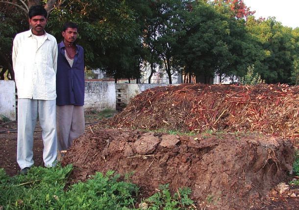 4.4 Compost Composting is the process of transforming or- ganic material of plant or animal origin into high-value organic manure in heaps or pits. Compared to uncontrolled decomposition of organic material, decomposition through composting is faster. It heats up as part of the process, which results in a product of higher quality. If compost heaps are properly maintai- ned, loss of nutrients (especially nitrogen) can be kept low. Compost provides the crop with well-balanced ‘food’ and helps to increase the soil organic-matter content. Compost has both a long-term and a short-term effect on plant nutrition as nutrients are continuously released over a period of time. There are two general types of composting: Compost heaps in the Maikaal bioRe project, India. ‘continuously fed’ and ‘batch fed’ systems: Batch fed systems (all material is set up at once): During the first few weeks after setting The value of the compost very much depends up the compost, the material gets very hot. on the material used, and on how well the com- Weed seeds, diseases and pests are killed as a post is set up and maintained. If the compost is result of the high temperature. The process is too dry or too wet, a lot of nutrients (especially fast (within a few weeks), fewer nutrients get nitrogen) get lost and the quality of the com- lost, and the final material is of high quality. post is low. Thus, proper set-up of the compost Continuously fed systems (material is added and sufficient turning pays off. The results of again and again): These systems do not heat nutrient analysis done on samples from manure up during the composting process. They are and compost heaps in the Nimar Region, India, handy if there is a continuous supply of was- prove this (Figure 14). tes (e.g. from cleaning the cow sheds). Howe- ver, they lack the advantages of the heating phase and thus decompose less completely. Vermi-compost heaps are a good example of a continuously fed system. Figure 14: Nutrient con- tents (% dry matter) of samples of different com- post and dung heaps col- lected on organic farms in the Nimar Region, India Organic Cotton Crop Guide 23