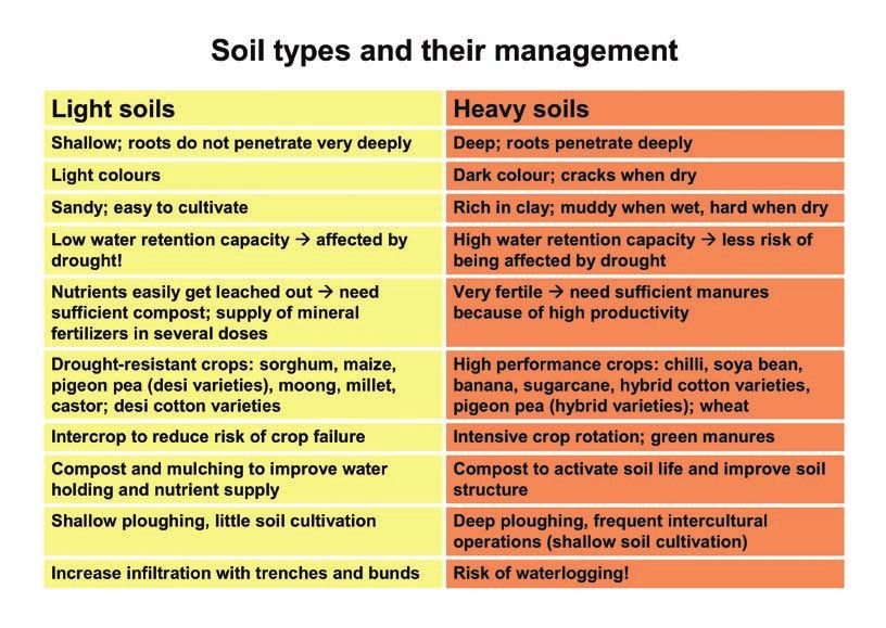 3 Soil Fertility Management 3.1 Soil properties The best strategy for improving and maintai- application of compost is particularly impor- ning soil fertility in cotton primarily depends on tant for increasing water retention and nutrient the soil types present on a farm. Soil types in the supply. As these soils are less suitable for inten- Nimar Region, India, can be broadly grouped sive production, the variety and crop selection into light soils (Inceptisol), medium soils (Enti- should be adapted accordingly (robust, frugal, sol) and heavy soils (‘black cotton soil’, Vertisol). and drought-resistant cotton varieties and ro- Their distribution in the landscape mainly de- tation crops). Intercropping of more drought- pends on the profile (see graph below). resistant crops like sorghum, safflower, sesame, Light soils usually have a lower water-reten- or castor can help to reduce the risk of complete tion capacity, and the nutrients are more easily crop failure in drought-prone areas. Soil culti- leached out than in heavy soils. In light soils, the vation should be shallow and kept to a mini- mum in order to avoid soil erosion and enhan- ced decomposition of organic matter. In deep or heavy soils (e.g. black cotton soil), intensive production is possible with sufficient inputs of organic manures, intensive crop ro- tation, and green manuring. Frequent shallow- soil cultivation helps to improve soil aeration and nutrient supply. It also reduces evaporation and suppresses weeds. When the cotton crop is well established (after 6–9 weeks) it is recom- mended to apply additional organic manure (e.g. vermi-compost or oil cakes) and to earth up ridges in order to accelerate decomposition Soils in the Nimar Region, India, usually follow a sequence, with light and of manures and to bury weeds. The soil pro- sandy soils on elevations and deep and heavy soils in depressions and river belts perties and management recommendations for light and heavy soils are given in Figure 7. Soil profile in a cotton field in India Figure 7: Properties and management recommendations for light and heavy soils 14 Organic Cotton Crop Guide