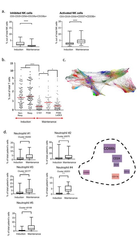 Page 16 of 16 Figure 2. Mass Cytometry: Supervised analysis (a-b), Unsupervised analysis (c-d). (a) In responders (comparing baseline [pre‐induction] timepoint to pooled maintenance timepoints), activated NK cells were enriched whereas inhibited NK cells were reduced. (**** = P