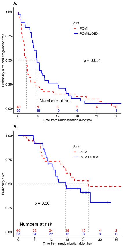 Page 15 of 16 Figures Figure 1. Kaplan-Meier survivor functions for modified Intention to treat population (from time of randomisation) (mITT: POM n= 40, POM-LoDEX n=38). In anticipation of early or late differences between the maintenance treatment arms in their time‐to‐event outcomes, six comparisons between the arms were planned at 3, 6, 9, 12, 15 and 18 months from randomization. To account for multiplicity of comparisons, a Bonferroni adjustment to the alpha‐level of each test was implemented, namely a comparison between the treatment arms at one of these time points was judged to be statistically significant if the associated p‐value was ≤0.0083. The test was based on the complementary log‐log transformation of the survival function. (a) Progression free survival: POM arm 2.6m (95% CI: 1.8m to 3.0m) versus 5.7m (95% CI: 4.5m to 7.5m) for POM‐LoDEX (logrank p=0.051; HR=0.63, 95%CI: 0.40 to 1.00), early PFS favoured POM‐LoDEX, however late survival favoured POM: a comparison of PFS at six 3‐monthly intervals favoured POM‐LoDEX (3m to 12m, P