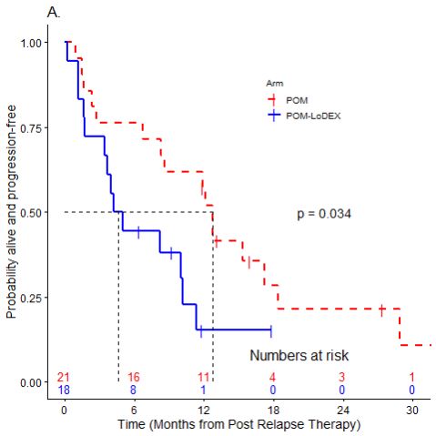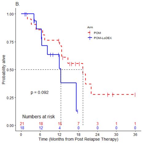 Supplementary Figure 1. Post progression therapy (Kaplan-Meier survivor functions): Of the mITT population (n=78), 39 patients had post progression therapy data available (POM n=21, POM-LoDEX n=18). Of the remainder, 18 were palliated and 21 did not have available data. (Noting that this is not a randomized comparison and should be interpreted in conjuction with results in Figure 1). (a) Median second PFS (defined from commencement of post progression therapy) significantly favoured patients previously treated in the POM arm: median 12.7m (IQR 6.7–17.2m) versus POM-LoDEX arm: median 4.6m (IQR 1.74–0.2m) (P=0.034) (Figure 2a). (b) Patients randomised to the POM arm also tended to have superior OS: median OS (from commencement of post progression therapy) for POM 19.4m (IQR 12.1m–NA) versus 12.5m (IQR 6.3–17.4m) for POM-LoDEX (P=0.092). There was no difference in response to salvage therapy between the two arms, and no difference in PFS/OS between individual treatment groups (bortezomib, carfilzomib, chemotherapy, thalidomide, LEN or other). (a) Second PFS (b) OS
