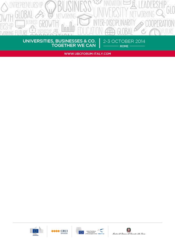 http://www.ubcforum-italy.com/Table of Contents List of abbreviations Introduction…………………………………………………………………………………………………….. 1 Emerging Themes…………………………………………………………………………………………….. 2 Day One - 2 October 2014 Welcome address…………………………………………………………………………………………….. 3 Opening speeches…………………………………………………………………………………………….. 4 Round table: How can national and European policies influence universities to recognize their role 8 as economic growth drivers and support entrepreneurship education in any discipline to provide students, researchers, staff and teaching staff with the knowledge, skills and motivation to engage in entrepreneurial activities as entrepreneurs and intrapreneurs. Round table: Rethinking and opening up education: The university and business cooperation for 15 modern learning achievements. New and innovative approaches for delivering education more suitable to prepare graduates for the job market and to continuing education, upgrading and requalification of employees. Round table: Business creation and employability: how to boost growth and competitiveness with 24 quality education and entrepreneurial skills. Which transversal skills can be taught in cooperation with enterprises to strength employability, creativity and new professional paths? Closing session of Day One 28 Day Two - 3 October 2014 Round table: Strategic alliances and the creation of ecosystems: The role of the public sector, of 29 enterprises and universities at a local, regional, national and European level for the creation of a knowledge economy Additional input for discussion…………………………………………………………………………..... 35 Policy outlook – Looking ahead………………………………………………………………………….... 38 Coffee Breaks Presentations………………………………………………………………………………… 40 Appendices List of the speakers …………………………………………………………………………………………… 45 List of Participants. ………………………………………………………………………………………….. 60 Programme……………………………………………………………………………………………………… 68