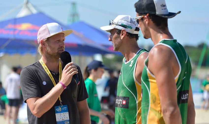 German world champion Julius Brink (left) interviews Brazilian world champion Marcio Araujo (center) after a country quota match with Saymon Barbosa