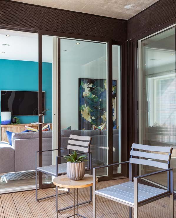 entertaining. Tall, inset glazing is juxtaposed by balconies that allow
