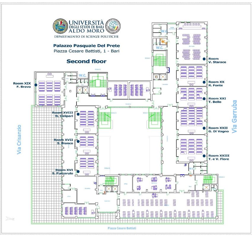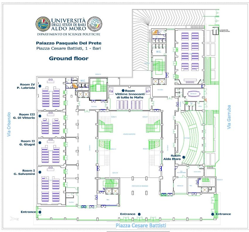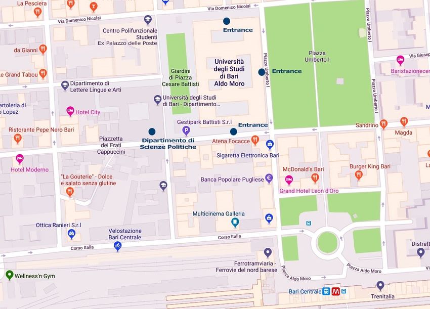 @migrationevent | #tmc19bari | www.migrationconference.net Venue: Department of Political Science, University of Bari The TMC 2019 Conference venue is the Department of Political Science, University of Bari “Aldo Moro” in Bari, Italy. Bari is Puglia’s regional capital in South Italy. Bari and the surrounding areas are full of touristic attractions to be explored. For details please visit the website of Tourism Office of Puglia: https://www.agenziapugliapromozione.it/portal/en/home. The Venue Address: Dipartimento di Scienze Politiche, Università degli Studi di Bari “Aldo Moro”, Piazza Cesare Battisti, 3, 70121 Bari BA, Italy. The registration desk area, parallel session rooms and plenary session halls for the TMC2019 can be found on the ground floor of the Department of Political Science. Please see the maps below for details. Useful information Emergency phone numbers to contact Carabinieri – Pronto intervento: 112 Police (Polizia di Stato): 113 Ambulance: 118 Fire Brigade: 115 Airoport: 0039.080.5800200 (same number for all airports of the Region) Border Police: 0039.080.5316196 Hospital (Policlinico): 0039.080.5575724 Emergency phone numbers work 24 hours per day, 7 days a week, every day. They are free of charge and they don’t need any international code. Opening hours Public administration: Monday to Friday 8.30 – 15.30 or 17.30. Banks: Monday to Friday 8.30 – 15.30 or 17.30. Banks are closed on Saturday and Sunday. Pharmacies: Monday to Friday 8.30 – 13.00 and 17.00 – 20.00. Some are open also on Saturday and Sunday with no restriction of time. Travel Agency If you wish to organise a trip in Apulia Region or elsewhere, you can contact: Travel Agency Systemar Viaggi Via Andrea da Bari n. 129 70121 Bari – Italy Telephone +39.080.5234330 +39.080.5232574 e-mail: monica@systemarviaggi.it 13