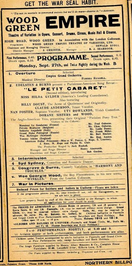 Wood Green Empire programme from 29 September 1915 From the collections and © Bruce Castle Museum (Haringey Archive and Museum Service) Wood Green Empire programme for a pantomime performance of Aladdin, from December 1923 From the collections and © Bruce Castle Museum (Haringey Archive and Museum Service)
