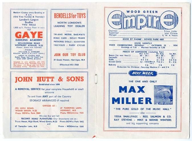 Detail from a Programme from 1915 showing the elaborate interior of the auditorium. From the collections and © Bruce Castle Museum (Haringey Archive and Museum Service) Famous acts to perform at the Empire included Marie Lloyd, Norman Wisdom, Shirley Bassey and Max Miller. Below is just a small selection of programmes from the Empire that we hold in the Archive.