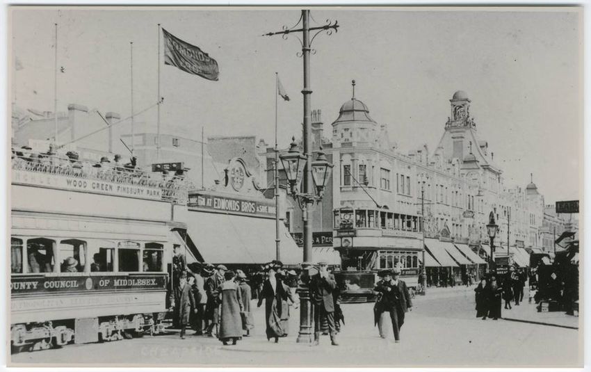 This image and article by Janet Owen of the Hornsey Historical Society, gives a bit more information about his time in Hornsey. Matcham’s humble background (his father was a brewery clerk) and lack of qualifications meant he was snubbed by fellow architects. In spite of this, his attention to detail (each of his theatres were unique) and his ability to build on difficult sites with speed and to budget, meant that theatre owners quickly turned to him for their builds or refurbishment. Theatre and music hall goers flocked to his theatres, as he designed them with the audience in mind, paying attention to their comfort, the building’s acoustics and of course their visual splendour. A visit to one of Matcham’s theatres was to be enjoyed on many levels. All of these aspects meant that the owners could book the top performers of the day – something else which brought the audiences in and made the owners very happy. He also designed pubs, cinemas, hotels, ballrooms and shopping arcades – including the stunning County Arcade in Leeds. The height of his work was during the period were he partnered with Moss Empires from 1892-1911. During this period some of his most noted theatres in London were built including the Hippodrome (1900), Hackney Empire (1901), Coliseum (1903), Palladium (1910) and Victoria Palace (1911). In total, Matcham was responsible for designing 21 theatres for Moss Empires over a 20-year period which ended with our very own Wood Green Empire, in 1912. Sadly, now only around 25 of his theatres still run as theatres in the UK, some others exist as bingo halls, churches and other spaces. Have a look at the Frank Matcham Society’s website for more about the man and his amazing buildings he designed. So let’s now take a look at the Wood Green Empire. The theatre opened on the High Road, Wood Green on the 9 September 1912. The exterior of the building was included in a parade of shops named Cheapside and the entrance to the theatre had a tiled mansard roof with an open dome on top. The auditorium ran