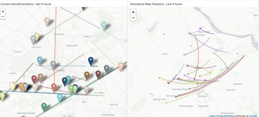 © 2018 SPLUNK INC. dump1090 ▶ ./dump1090 --write-json ./data --max-range 1000 • Writes a JSON file with updated data • Consumed via monitor stanza, essentially re-consuming entire file every time • { "now" : 1527686991.8, "messages" : 6848, "aircraft" : [ {"hex":"acc1ef","squawk":"6257","lat":39.320161,"lon":- 76.602356,"nucp":7,"seen_pos":58.8,"altitude":7300,"vert_rate":2368,"trac k":258,"speed":281,"mlat":[],"tisb":[],"messages":41,"seen":25.5,"rssi":- 18.1}, {"hex":"abba6b","mlat":[],"tisb":[],"messages":977,"seen":241.5,"rssi":- 21.7}, {"hex":"a32e86","mlat":[],"tisb":[],"messages":1559,"seen":70.7,"rssi":- 20.6} ]}