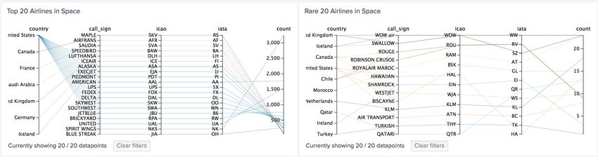 © 2018 SPLUNK INC. Top and Rare Airlines • Uses the Parallel Coordinates visualization • Sample taken over 7 days